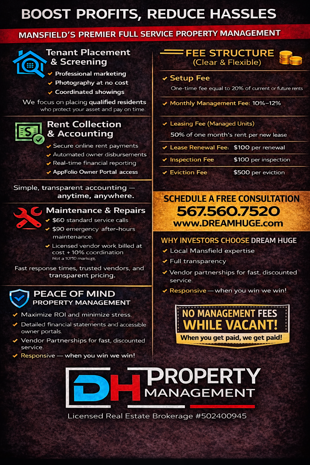 We are a full service property management and maintenance team. At Dream Huge Property Management we feel that if you are not getting paid we do not get paid! We also handle the day to day, including rent collection, deposits, utility bills, showing, leasing, maintenance, repairs and more so you can get back to what you love doing as an investor, which is investing! Fill out the form below to learn more! Make more, stress less and have happier tenants!